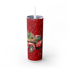 • Christmas 20oz Skinny Tumbler Vintage Red Pickup Truck With Christmas Snowflakes by Printify
